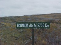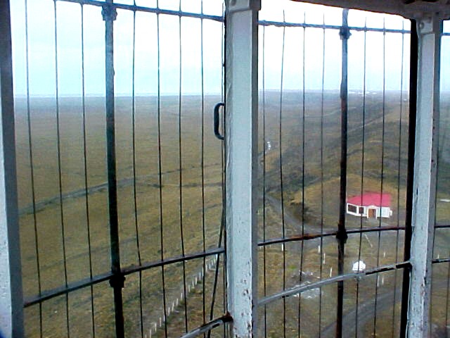 Vista desde la torre del faro, hacia el límite con Chile y la confitería. Un cartel nos recuerda cuan lejos estamos.