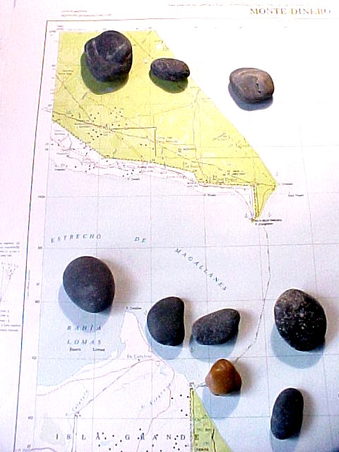 Cantos rodados. Restos de montañas pulverizadas por la acción de los hielos durante los períodos glaciarios. El suelo de la Patagonia está lleno de ellos y Cabo Vírgenes no es la excepción. En la foto, apoyados sobre una carta topográfica de la región de donde fueron traídos.
